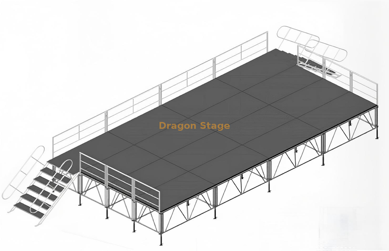 إن بناء المسرح معياري بالكامل، مما يسمح بتكوينات مختلفة الحجم والارتفاع بناءً على احتياجات الحدث.