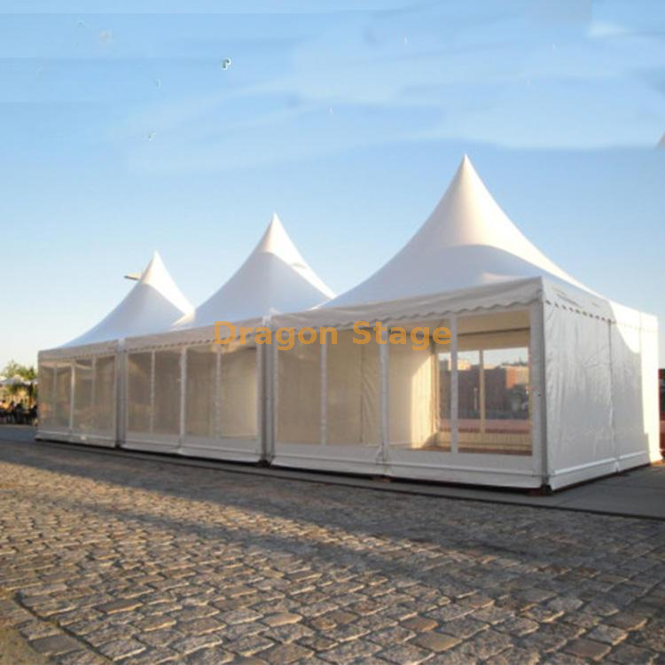 بالإضافة إلى سماتها الوظيفية، لا يمكن إنكار المظهر الجمالي للخيمة.ينضح اللون الأبيض الكلاسيكي بإحساس النقاء والأناقة، ويمتزج بسلاسة مع مختلف المناطق المحيطة وموضوعات الأحداث.يضيف تصميم الباغودا بخط السقف المميز لمسة من السحر التقليدي، في حين تعمل النوافذ على تعزيز الجاذبية البصرية، مما يخلق إحساسًا بالانفتاح ويدعو الضوء الطبيعي للعب دور في تشكيل الجو.