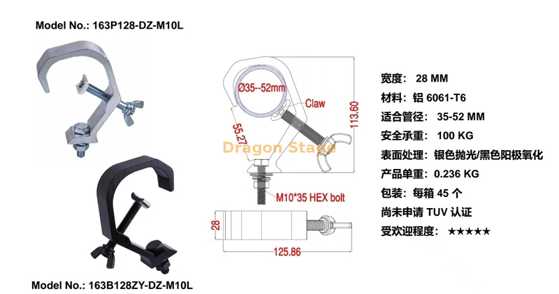 مرحلة الضوء المشبك C المشبك 100 كيلوغرام حمولة الحمل المشبك الجمالون الألمنيوم للأنابيب 35-52 مم