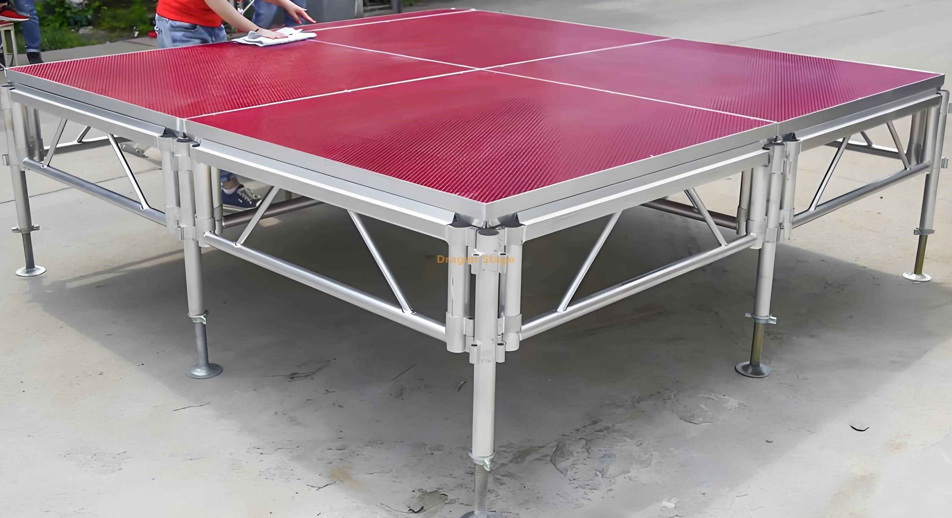يمكن تخصيص المرحلة المربعة خفيفة الوزن المصنوعة من الألومنيوم مقاس 1.22 × 1.22 م لتلبية احتياجاتك الخاصة. يمكنك الاختيار من بين مجموعة متنوعة من ألوان المنصة، بما في ذلك الأحمر والأسود والبني، لتتناسب مع موضوع الحدث الخاص بك. يمكن أيضًا تخصيص شكل المسرح لإنشاء تصميمات فريدة وملفتة للنظر، مثل أشكال T أو الدوائر أو الأشكال غير المنتظمة.