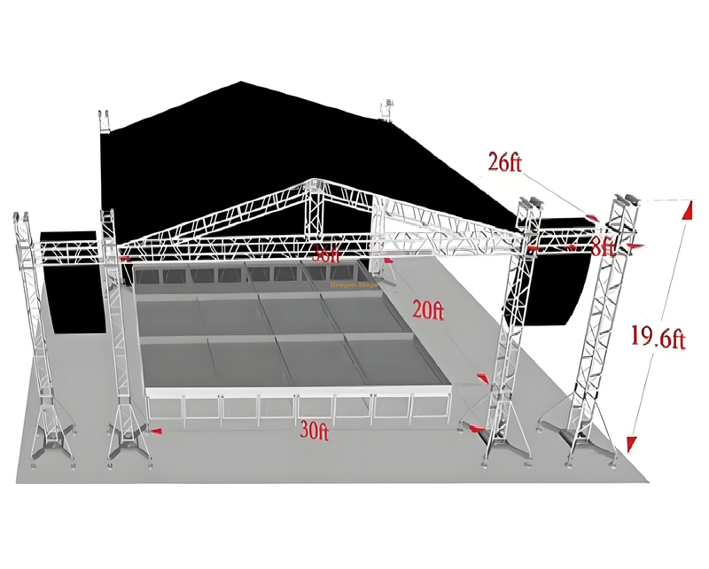 هذا هو نظام سقف الجمالون في الهواء الطلق المخصص من نوع حنفية مع أبعاد صافية تبلغ 36 × 26 × 20 قدمًا ، ويبلغ عرض جناح الجمالون 8 أقدام. تم تصميم هذا النظام لتوفير بنية قوية وموثوقة للأحداث في الهواء الطلق ، مما يضمن أن إعداد المسرح الخاص بك وظيفي وجذاب بصري. يسمح تصميم الجمالون المخصص للتجميع وتفكيكه بسهولة ، مما يجعله خيارًا مناسبًا للهياكل المؤقتة. تستوعب الأبعاد الفسيحة إعدادات ومعدات المرحلة المختلفة ، في حين أن جناح الجمالون العريض الذي يبلغ طوله 8 أقدام يضمن توزيع الصوت الأمثل. يعد نظام سقف الجمالون في الهواء الطلق هذا مثاليًا للحفلات الموسيقية والمهرجانات وغيرها من الأحداث الخارجية على نطاق واسع.