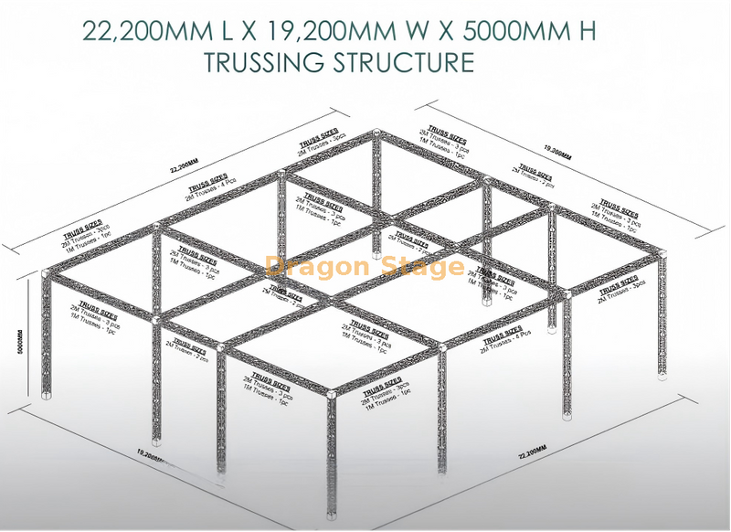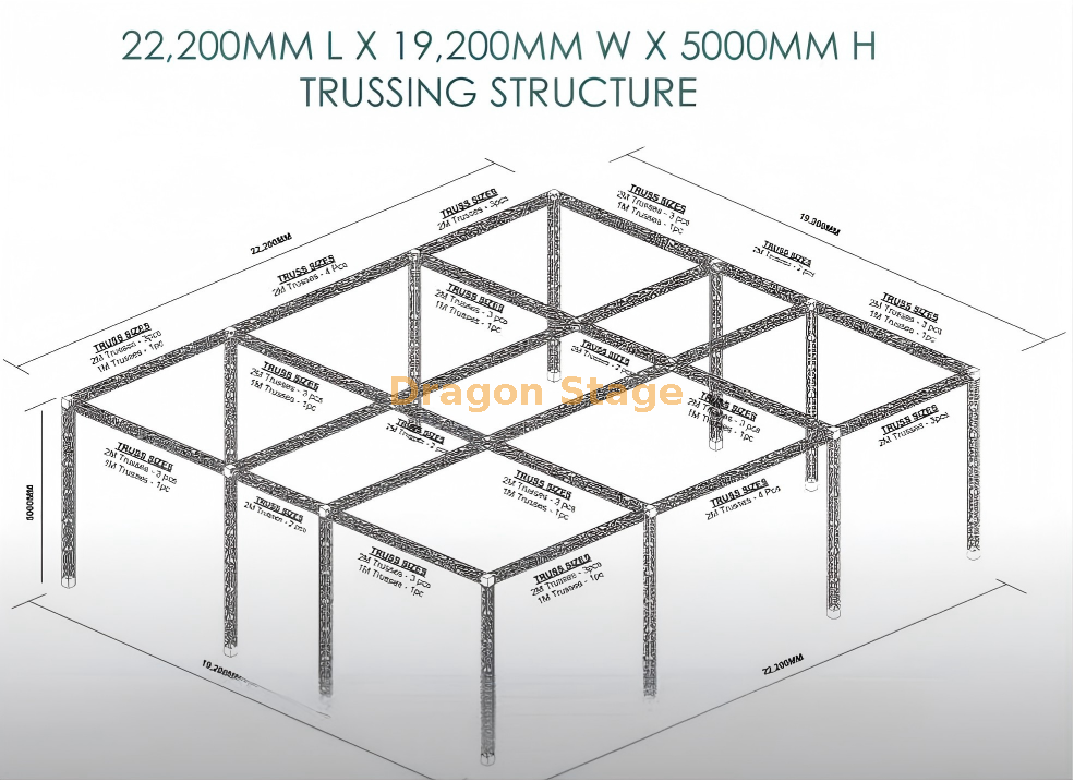 يعد نظام عرض Truss المعياري الاحترافي مقاس 21 م × 17 م حلاً هيكليًا من الدرجة الصناعية مصممًا لقاعات المعارض الضخمة والعلامات التجارية للأحداث كبيرة الحجم. بمساحة إجمالية تبلغ 22,200 مم طولًا و19,200 مم عرضًا ، يوفر هذا النظام شبكة علوية لا مثيل لها للإضاءة المعقدة، واللافتات، وتعليق المنتج.