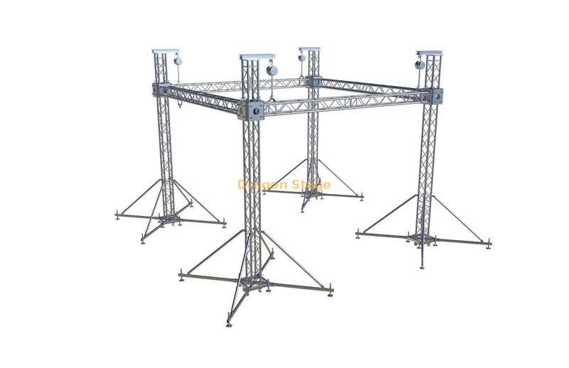 نظام تروس إطار المسرح: تم تصميم هيكل الجمالون خصيصًا لإنشاء إطار مستقر وآمن لدعم المسرح أو المنصة. وهو يتألف من قطاعات الجمالون المصنوعة من الألومنيوم المترابطة التي تشكل هيكلًا صلبًا قادرًا على تحمل وزن معدات المسرح والإضاءة وأنظمة الصوت وفناني الأداء.