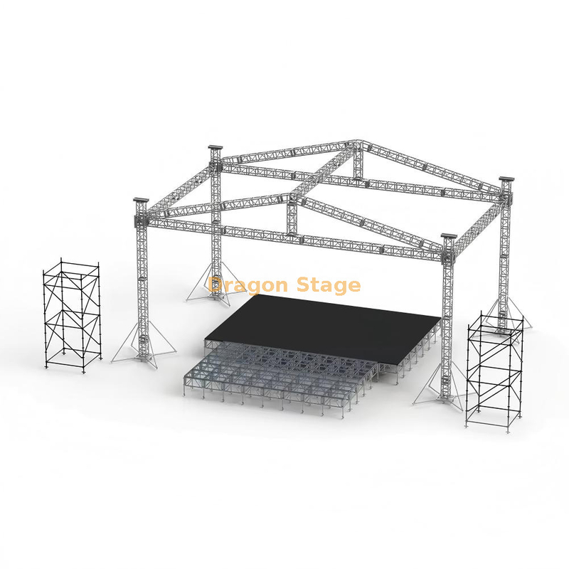 لتوفير حل كامل للمكان، تم تصميم هذا السقف الهرمي للتكامل السلس مع منصات المسرح المعيارية المصنوعة من الألومنيوم. تتميز هذه الأسطح بأسطح مضادة للانزلاق مقاس 18 مم وقدرات تحمل عالية، مما يخلق أساسًا احترافيًا وآمنًا لفناني الأداء أسفل المنصة العلوية الضخمة (المصدر: https://www.dragontruss.com/Aluminum-Stage-Platform-pd463987768.html ).